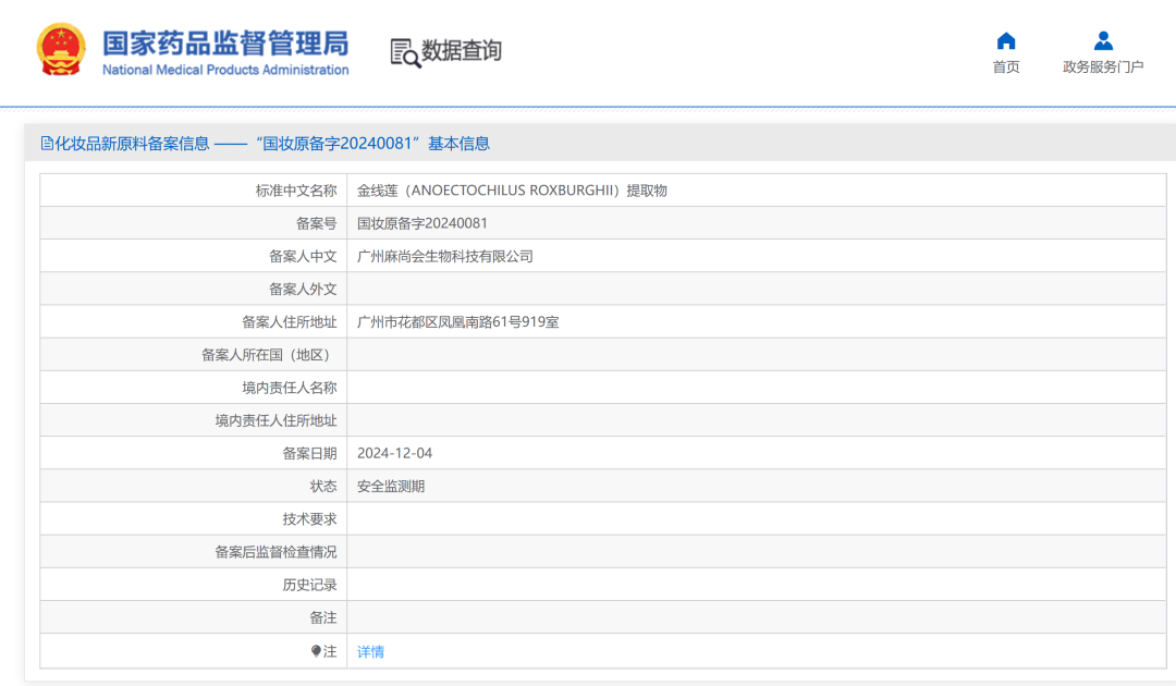 广州麻尚会科技有限公司2022年起在国内首次提出化妆品CRO研发外包与概念验证平台建设,具备从化妆品原料筛选、新原料备案、安全毒理研究、配方研发、功效评价、防腐挑战、包材相容性测试等研究检测功能。2024年麻尚会公司完成金线莲提取物新原料备案,为金线莲化妆品产业化打开法规之门。