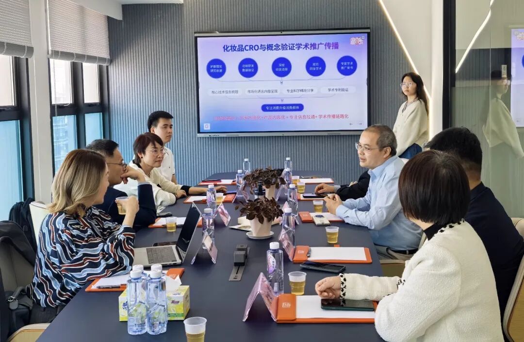 参观后双方在会议室座谈,共同探讨国内化妆品科研创新思路与化妆品科学传播方向。麻尚会公司CRO项目负责人邹洁副总经理为到访嘉宾分享麻尚会化妆品科研创新模式各类成果和成果转化进展,踏实验证了广州麻尚会化妆品CRO团队提出的“化妆品科研创新的终极目标是为了转化落地”!