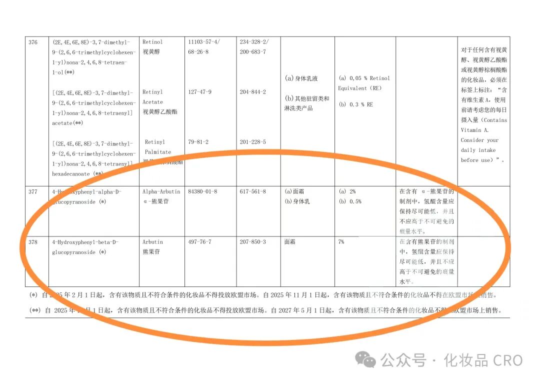 2024年4月3日,欧盟委员会发布法规(EU) 2024/996,修订(EC)1223/2009欧盟化妆品法规:新增多个限用成分,新增α-熊果苷(Alpha-Arbutin)(*)、熊果苷(Arbutin)(*)、染料木黄酮(Genistein)(*)、大豆苷原(Daidzein)(*)、曲酸(Kojic Acid)(*)、视黄醇(Retinol)(**)、视黄醇乙酸酯(Retinyl Acetate)(**)、视黄醇棕榈酸酯(Retinyl Palmitate)(**)等限用成分。其中α-熊果苷面部产品最高添加量2.0%,身体用产品最高0.5%,熊果苷最高添加量7%(基本上没人用)。