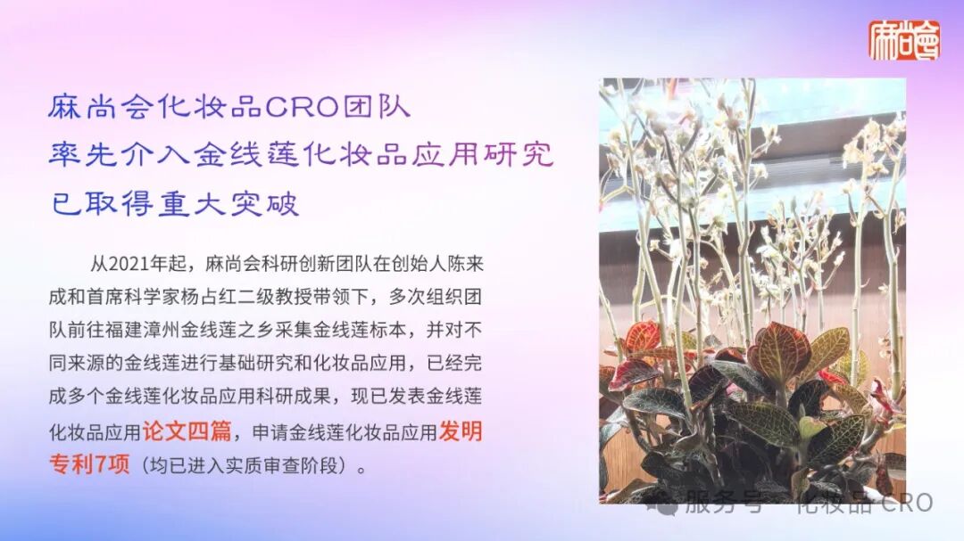 在申报新原料前,麻尚会化妆品CRO团队不仅仅做了金线莲基础研究,包括金线莲提取工艺研究、安全毒理性测试,还从金线莲物种鉴定、金线莲活性成分提升、金线莲护肤功效验证、金线莲化妆品配方研发等全方位开展实用性研究,形成自有的核心知识产权,最后才提交金线莲新原料备案。