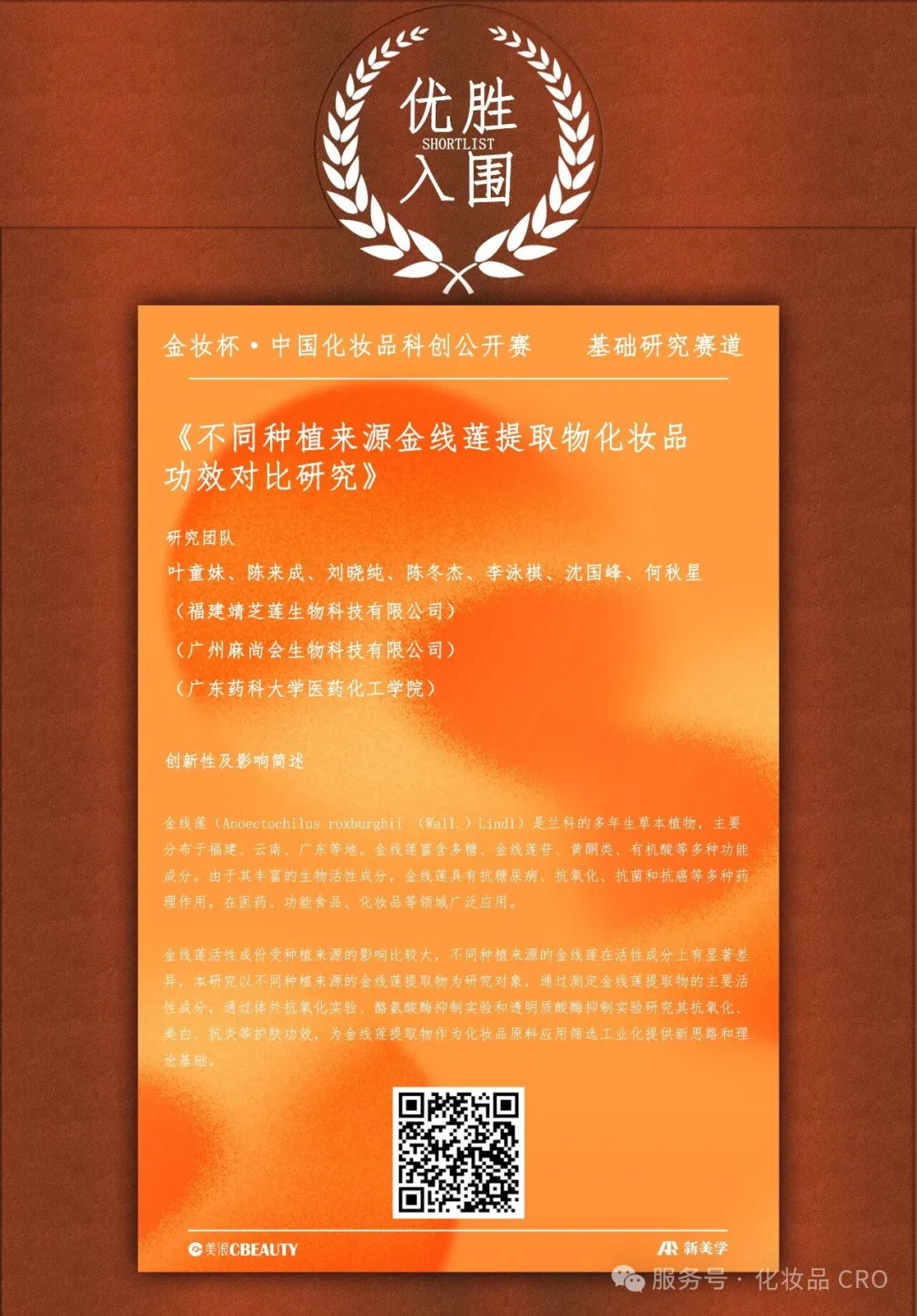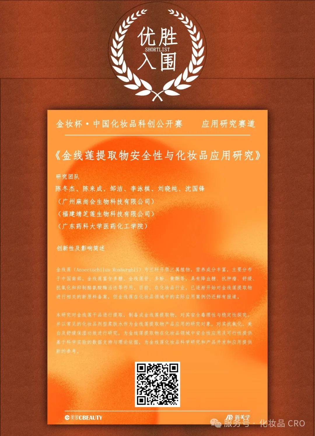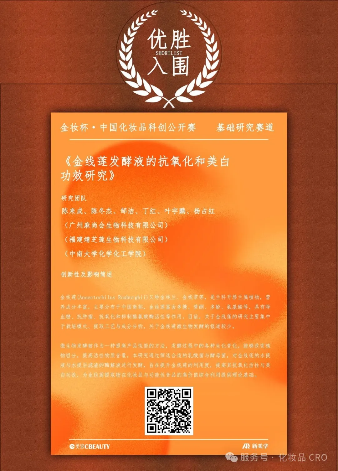 其中,《金线莲发酵液的抗氧化和美白功效研究》和《不同种植来源金线莲提取物化妆品功效研究对比》获得「基础研究赛道」入围,《金线莲提取物安全性与化妆品应用研究》获得「应用研究赛道」入围,体现了麻尚会化妆品CRO在金线莲提取物新原料应用研究的行业领先优势,为金线莲化妆品概念验证添砖加瓦。