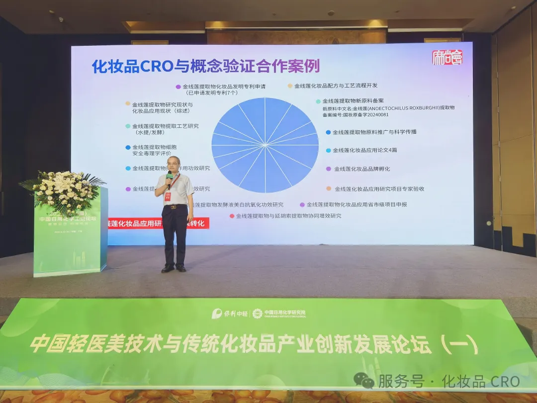 针对化妆品CRO赋能轻医美护肤需求,在分享中,陈来成也介绍了化妆品CRO的运作方式和对轻医美品牌的做法,并以金线莲提取物新原料创新研发CRO项目为案例,介绍了金线莲新原料科研创新与成果转化落地、金线莲化妆品品牌孵化进展,以循证科学思路为指导方向,为植物提取物特别是金线莲化妆品概念在化妆品行业大面积科普推广!