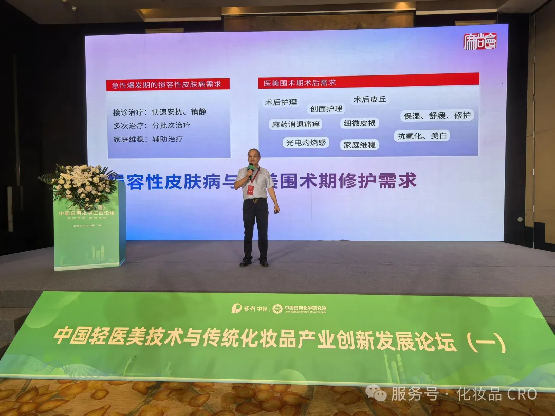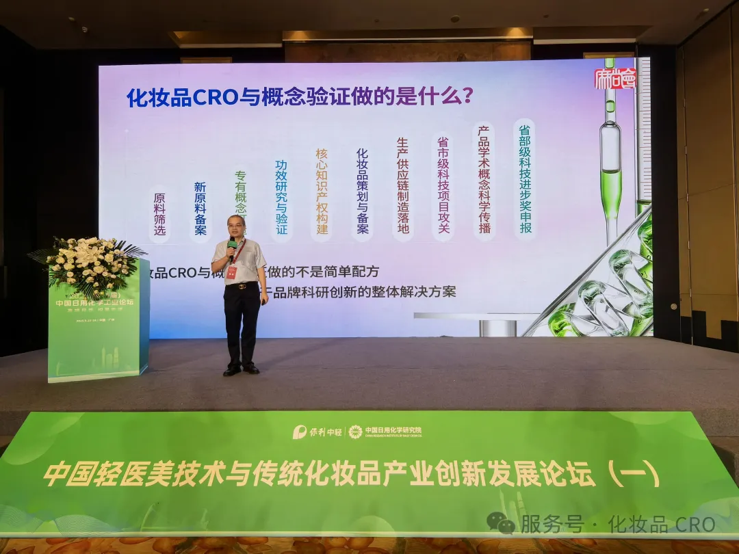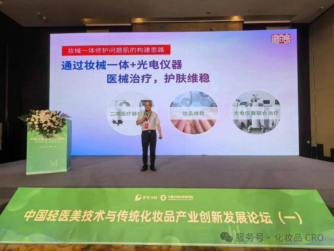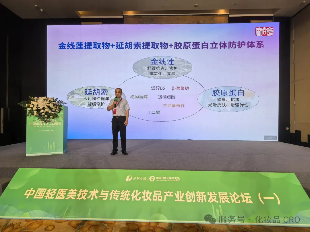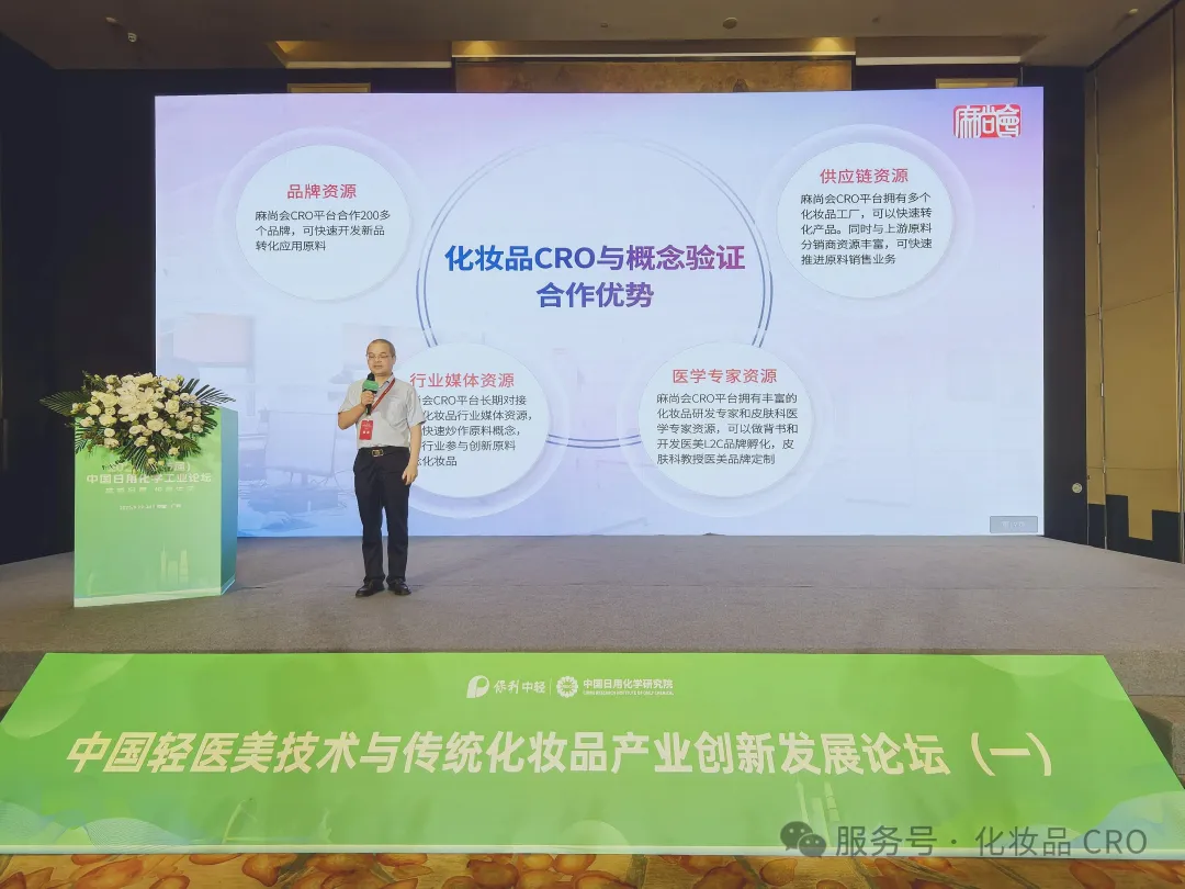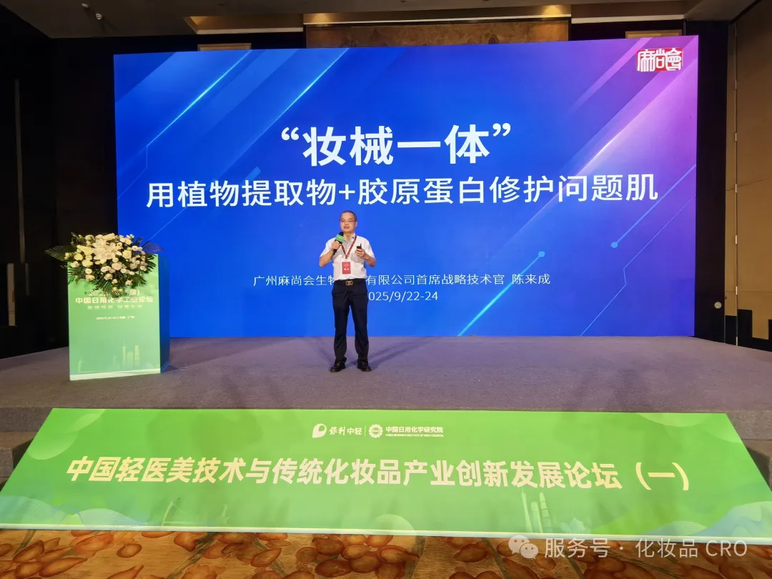 2025年9月24日,在今年第18号超强台风桦加沙台风“五停”下,中国轻医美技术与传统化妆品产业创新发展论坛在美丽的花都皇冠假日酒店会议厅召开!作为论坛开场分享嘉宾,广州麻尚会化妆品CRO与概念验证平台创始人、资深化妆品研发专家陈来成先生为与会嘉宾带来《“妆械一体”用植物提取物+胶原蛋白修护问题肌》的分享报告,获得现场嘉宾的热烈掌声!